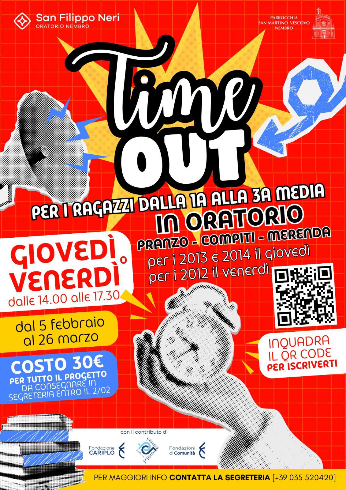 Pubblichiamo con piacere la notizia del nuovo progetto “Time Out”, per i 2012 - 2013-2014 che si svolge presso l'oratorio San Filippo Neri di Nembro. Un'occasione per pranzare in compagnia, dedicare il pomeriggio allo studio e finire con la merenda insieme.